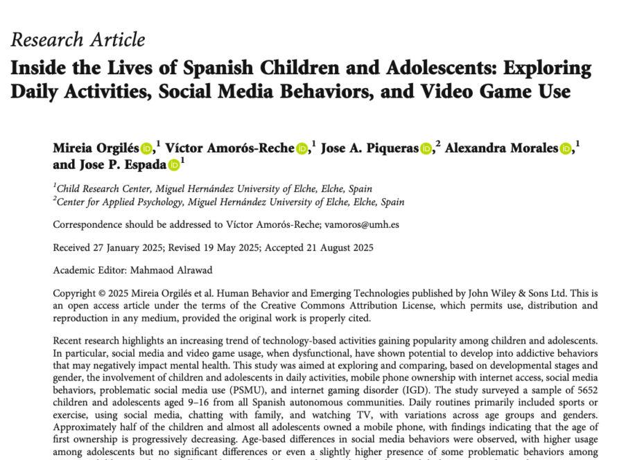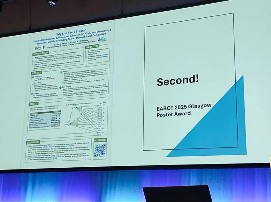 Novedades EMOChild visita centros escolares de Murcia Tercer seguimiento del estado emocional de los escolares de La Rioja Un estudio del Proyecto EMOChild examina los hábitos digitales en escolares españoles Investigadores de EMOChild analizan la salud mental de escolares de Baleares Premiado en el congreso de la EABCT un estudio del Proyecto EMOChild El Centro de Investigación de la Infancia de la UMH lleva más de un año analizando la salud mental de niños y adolescentes Crónica de la III Jornada Científico-Profesional El Consejo General de la Psicología difunde los resultados cualitativos del Proyecto EMO-CHILD El Observatorio de la Salud Mental Infanto-Juvenil presenta sus primeros informes técnicos en el Colegio Oficial de la Psicología Un grupo focal aborda los desafíos de la crianza adolescente Nuevos grupos focales en el IES Cayetano Sempere dentro del proyecto EmoChild Emo-Child impulsa el bienestar psicológico infantil en Andalucía con sesiones participativas Nuevos grupos focales en la Región de Murcia Se presenta el Observatorio Español de la Salud Mental Infanto-Juvenil Jornada sobre salud mental en la infancia y adolescencia: Un punto de partida ante los nuevos retos EMOChild organiza varios seminarios formativos sobre salud mental para centros educativos El equipo EmoChild completa la fase de evaluación clínica Estudiantes de Primaria de Murcia hablan sobre salud mental Jornada sobre salud mental en la infancia y adolescencia: Acciones globales ante un problema complejo Conversamos con psicólogas de la Comunidad de Madrid para explorar el estado de la salud mental de niños y adolescentes Grupos focales con adolescentes para mejorar la salud mental Grupos de madres participan en el estudio EMO-CHILD EMO-CHILD toma el pulso al trabajo en salud mental infantil convocando grupos focales de expertos Mireia Orgilés presenta el proyecto EMO-CHILD en la televisión de Asturias 9th International Congress of Clinical and Health Psychology in Children and Adolescents